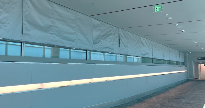 The DSI Smoke and Fire Curtain Model DSI-C3HRSS single barrel configuration for widths under 16ft and Model DSI-C3HRSM multi barrel configurations for widths over 16ft create a three hour opening protective smoke and fire barrier.